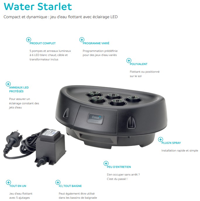 Jeu d'eau de qualité, avec trois jets différents et illumination par LED.