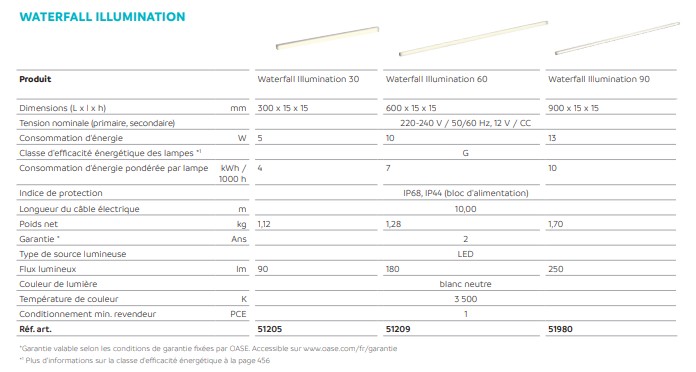 L'éclairage LED pour cascades Waterfall Illumination 60 assure des accents lumineux élégants le soir. Grâce à des glissières en plastique innovantes, la lampe de 60 cm de large peut être facilement installée ultérieurement sur OASE Waterfall 60 ou pour l'éclairage de la terrasse et des bords de l'étang. Les diodes électroluminescentes blanc chaud, à peine visibles, assurent une lumière agréable avec seulement 10 watts. La livraison comprend un tuyau en caoutchouc robuste de 10 m et un transformateur à cordon avec une tension basse sûre de 12 volts.