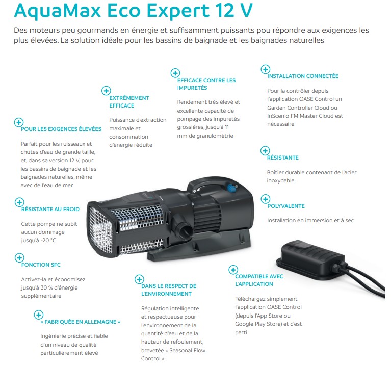 L'OASE AquaMax Expert 20000 / 12 V est une pompe de filtration et de cours d'eau très puissante. Avec sa technique 12 V sûre, elle est parfaite pour l'utilisation dans les bassins de natation et de baignade. Elle débite jusqu'à 18.600 l/h par heure et a une hauteur de refoulement maximale de 4,30 m. Nous fournissons le raccord d'entrée en 38-50mm pour cette pompe