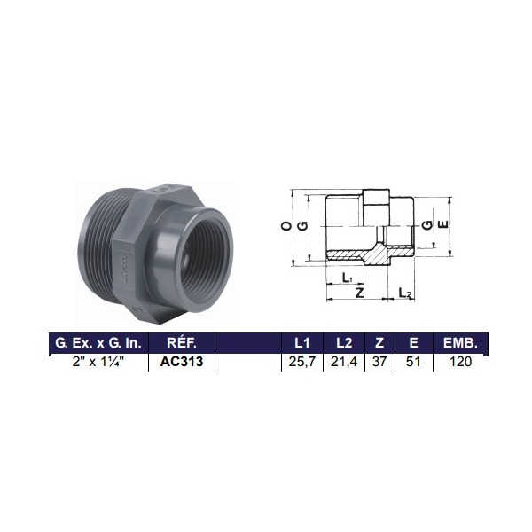 • Bassin de jardin : DOUILLE FILET EXTÉRIEUR FILET INTÉRIEUR 2" X 1"1/4, Raccord fileté cannelé