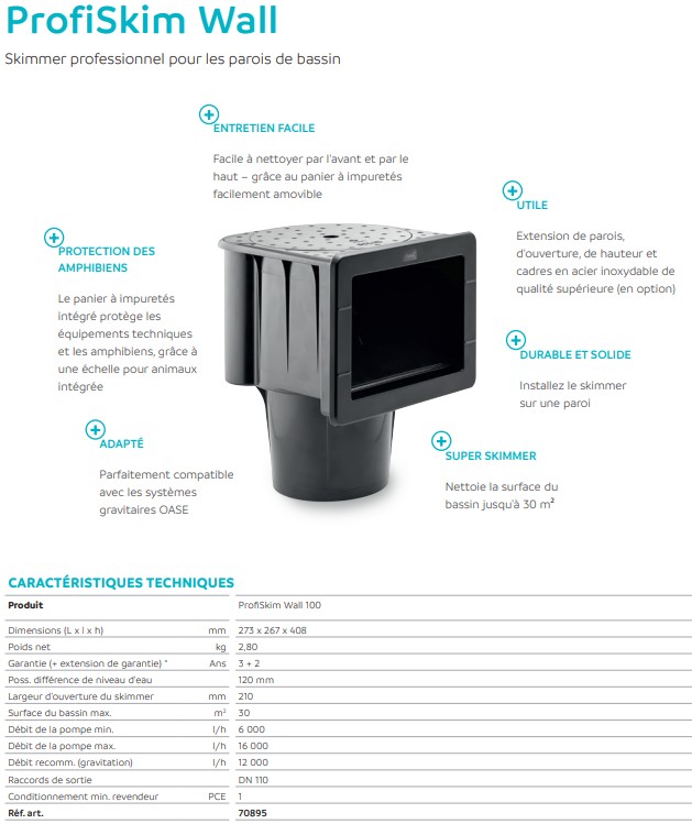 L'écumeur mural noir ProfiSkim Wall aspire les saletés sur les surfaces de bassin jusqu'à 30 m², avant même qu'elles ne tombent au fond. Il est doté d'un raccord DN 110 pour un débit optimal. Le panier à saletés intégré contient un escalier de triton qui permet aux amphibiens aspirés de remonter à l'air libre. Il existe des accessoires utiles que vous pouvez acheter pour le ProfiSkim Wall : Rallonge murale, rallonge à large bouche, rallonge de hauteur et caches en acier inoxydable.