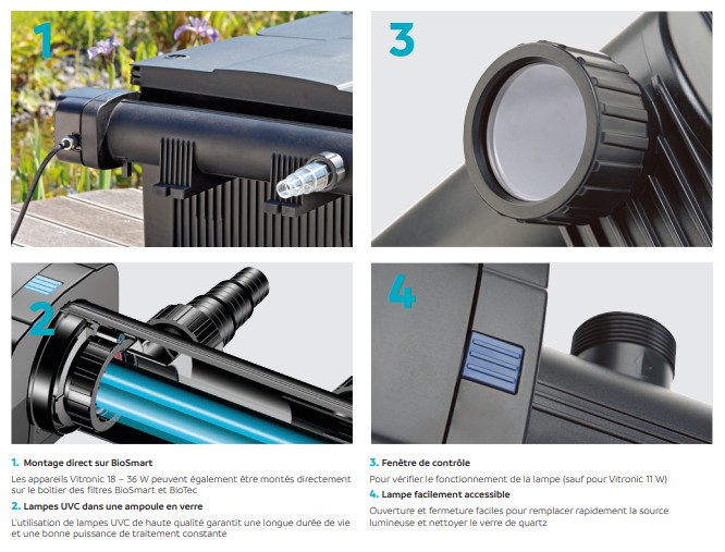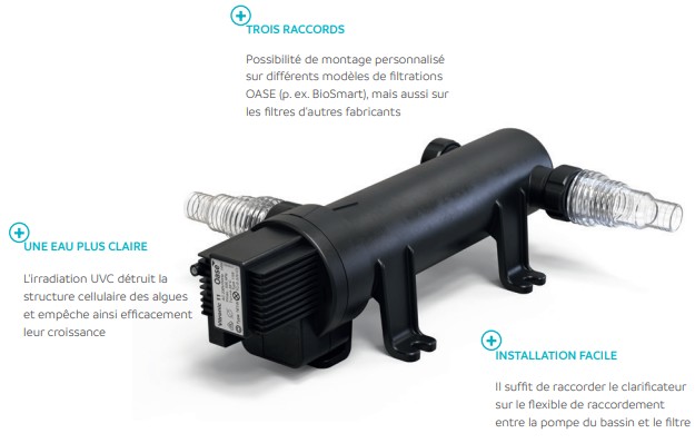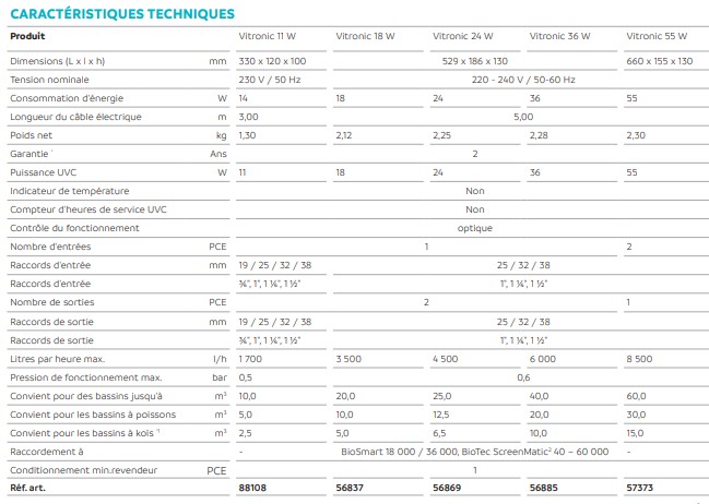 Le clarificateur UVC OASE Vitronic 24 W élimine les algues en suspension, réduit les bactéries nocives et garantit ainsi une eau claire. Maintenant tout nouveau : montage facile directement sur les filtres BioSmart et BioTec ! Le décanteur primaire avec technique de bypass est adapté à des débits max. de 4500 l/h et a une puissance absorbée de 24 watts. Une fenêtre de contrôle assure une grande sécurité de fonctionnement. La technique de fermeture rapide pratique facilite le nettoyage simple du verre en quartz. Le décanteur primaire UVC OASE Vitronic 24 W est disponible complet avec des douilles de tuyau graduées universelles pour le raccordement de tuyaux de 1" (25 mm) à 1 ½" (38 mm). De nombreux accessoires de raccordement permettent un montage facile. Le câble a une longueur de 5 m. La tension nominale est de 220-240 V/50-60 Hz. La garantie est de 2 ans.